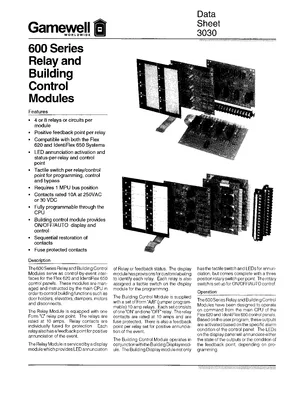 Datasheet for the Gamewell FCI 600 Series Relay and Building Control Modules, published in 1999. Document No: 3030, Rev: 7/99. 4 models including RM-4, RM-8, BC-4 and 1 additional variants. Engineering specifications, wiring diagrams, and mounting dimensions.