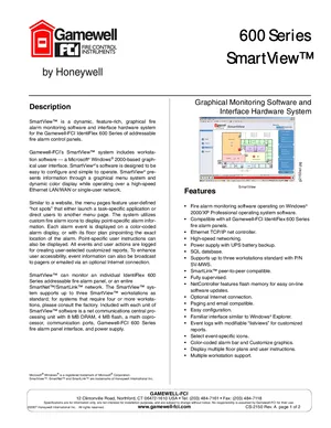 Datasheet for the Gamewell FCI 600 Series SmartView, published in 2007. Document No: CS-2150, Rev: A. Model SmartView. Engineering specifications, wiring diagrams, and mounting dimensions.