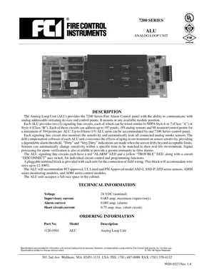 Datasheet for the Gamewell FCI 7200 Series ALU, published in 1997. Document No: 9020-0327, Rev: Ver. 1.4. 7 models including ALU, 1120-0503, ASD-I and 4 additional variants. Detailed technical specifications, electrical ratings, and agency listings.