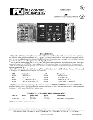 Datasheet for the Gamewell FCI 7200 Series DIU, published in 1997. Document No: 9020-0346, Rev: Ver. 1.5. Model DIU. Product features, environmental operating limits, and compatibility data.