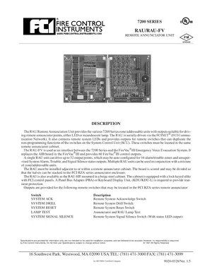 Datasheet for the Gamewell FCI 7200 Series Remote Annunciator Unit, published in 1997. Document No: 9020-0328, Rev: 1.5. Models RAU, RAU-FV and RAU-HP. Engineering specifications, wiring diagrams, and mounting dimensions.