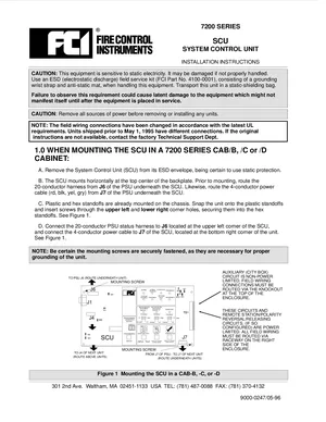 Installation Manual for the Gamewell FCI 7200 Series SCU, published in 1997. Document No: 9000-0247, Rev: 05-96. 6 models including SCU, 7200 Series, CAB-A and 3 additional variants. Hardware installation, terminal connections, and environmental requirements.
