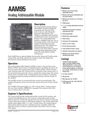 Datasheet for the Gamewell FCI AAM95, published in 2009. Document No: CS-2021, Rev: A. 8 models including AAM95, AAM95-1, AAM95-2 and 5 additional variants. Product features, environmental operating limits, and compatibility data.