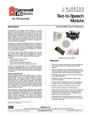 Datasheet for the Gamewell FCI Alertus Text-to-Speech (TTS) Module, published in 2015. Document No: GF12008, Rev: B. 7 models including ECS-PQ, ECS-R, AAB-T and 4 additional variants. Engineering specifications, wiring diagrams, and mounting dimensions.