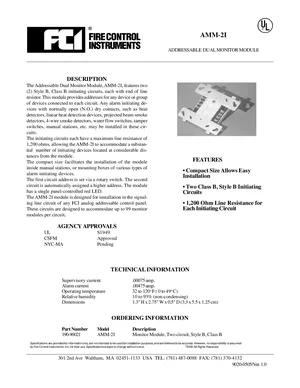 Datasheet for the Gamewell FCI AMM-2I, published in 2000. Document No: 9020-0505, Rev: Ver. 1.0. Model AMM-2I. Engineering specifications, wiring diagrams, and mounting dimensions.