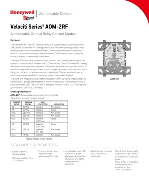 Datasheet for the Gamewell FCI AOM-2RF, published in 2019. Document No: 9020-0625, Rev: I. Models AOM-2RF and GWF-7075. Engineering specifications, wiring diagrams, and mounting dimensions.