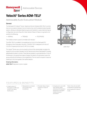 Datasheet for the Gamewell FCI AOM-TELF, published in 2017. Document No: 9020-0628, Rev: H. Model AOM-TELF. Product features, environmental operating limits, and compatibility data.