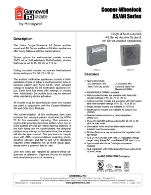 Datasheet for the Gamewell FCI AS and AH Series Audible Appliances, published in 2008. Document No: 9020-0572, Rev: C1. 10 models including AS-24MCW-FR, AS-24MCW-FW, AS-241575W-FR and 7 additional variants. Detailed technical specifications, electrical ratings, and agency listings.