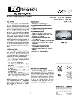 Datasheet for the Gamewell FCI ASD-IL2, published in 2003. Document No: 9020-0558, Rev: Ver. 1.2. 9 models including ASD-IL2, B501, B501BH and 6 additional variants. Product features, environmental operating limits, and compatibility data.