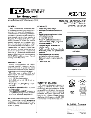 Datasheet for the Gamewell FCI ASD-PL2 and ASD-PTL2, published in 2003. Document No: 9020-0559, Rev: 1.2. 9 models including ASD-PL2, ASD-PTL2, B210LP and 6 additional variants. Engineering specifications, wiring diagrams, and mounting dimensions.