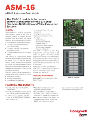 Datasheet for the Gamewell FCI ASM-16, published in 2020. Document No: 9020-0554, Rev: Q. 7 models including ASM-16, 1100-0455, INI-VGC and 4 additional variants. Product features, environmental operating limits, and compatibility data.