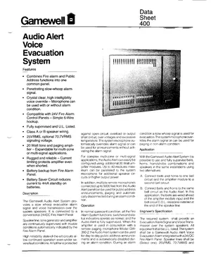 Datasheet for the Gamewell FCI Audio Alert Voice Evacuation System, published in 1995. Document No: 400, Rev: 10/95. 18 models including GW-360-M1, GW-367-M1, GW-360-M2 and 15 additional variants. Engineering specifications, wiring diagrams, and mounting dimensions.