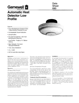 Datasheet for the Gamewell FCI Automatic Heat Detector Low Profile, published in 1999. Document No: 680, Rev: Revised. 15 models including 50414, 50415, 50416 and 12 additional variants. Product features, environmental operating limits, and compatibility data.