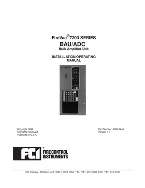 Installation and Operations Manual for the Gamewell FCI BAU and ADC, published in 1998. Document No: 9000-0445, Rev: 1.1. 16 models including BAU, ADC, 7200 Series and 13 additional variants. Hardware mounting, wiring, and user system management.