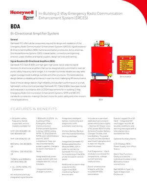 Datasheet for the Gamewell FCI BDA, published in 2018. Document No: 9021-6106, Rev: C. 6 models including GW-BDA400-1B, GW-BDA400-2B, GW-BDA150-1B and 3 additional variants. Product features, environmental operating limits, and compatibility data.
