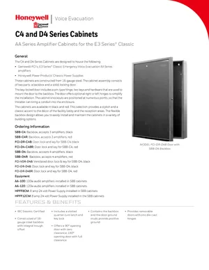 Datasheet for the Gamewell FCI C4 and D4 Series Cabinets, published in 2017. Document No: 9020-0615, Rev: G. 13 models including SBB-C4, SBB-C4R, FCI-DR-C4B and 10 additional variants. Product features, environmental operating limits, and compatibility data.