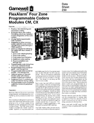 Datasheet for the Gamewell FCI CM and CX, published in 1999. Document No: 230. 13 models including CM, CX, CT and 10 additional variants. Product features, environmental operating limits, and compatibility data.