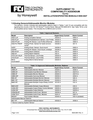 Compatibility Chart for the Gamewell FCI Analog Sensors and Modules. Document No: 9020-0651, Rev: A. 42 models including ASD-IL2F, ASD-PL2F, ASD-PTL2F and 39 additional variants. Device compatibility matrices, supported combinations, and cross-reference guidance.
