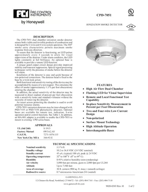 Datasheet for the Gamewell FCI CPD-7051, published in 2006. Document No: 9020-0303, Rev: H. 13 models including CPD-7051, PSD-7155, PSD-7156 and 10 additional variants. Detailed technical specifications, electrical ratings, and agency listings.