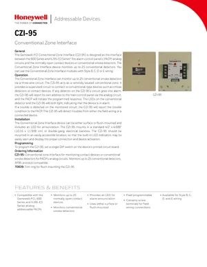 Datasheet for the Gamewell FCI CZI-95, published in 2019. Document No: CS-2043, Rev: D. 5 models including CZI-95, 70839, 600 Series and 2 additional variants. Engineering specifications, wiring diagrams, and mounting dimensions.