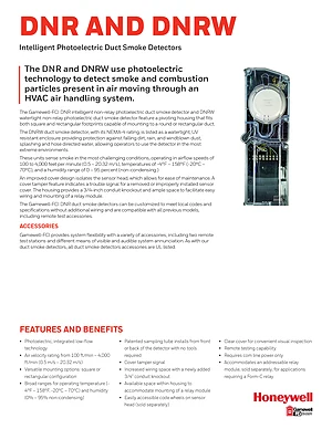 Datasheet for the Gamewell FCI DNR and DNRW, published in 2019. Document No: 9021-60475, Rev: F. Models DNR and DNRW. Engineering specifications, wiring diagrams, and mounting dimensions.