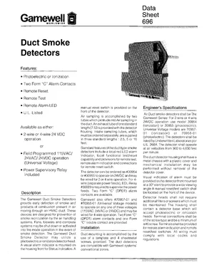 Datasheet for the Gamewell FCI Duct Smoke Detectors, published in 1999. Document No: 696, Rev: 7/99. 4 models including 30954, 30955, 70957-01 and 1 additional variants. Product features, environmental operating limits, and compatibility data.