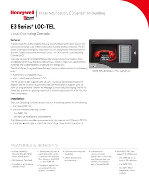 Datasheet for the Gamewell FCI E3 Series LOC-TEL, published in 2017. Document No: 9021-60644, Rev: D. Model E3 Series LOC-TEL. Engineering specifications, wiring diagrams, and mounting dimensions.