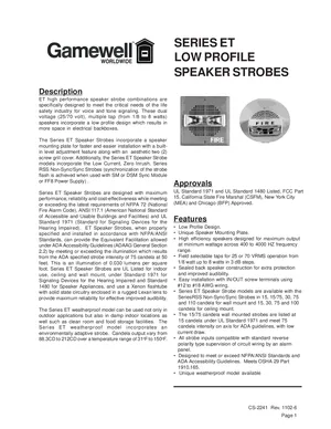 Datasheet for the Gamewell FCI ET Series Speaker Strobes, published in 2002. Document No: CS-2241, Rev: 1102-6. 13 models including ET70-24MCW-FR, ET70-24MCW-FW, ET1080-IS-24-VFR and 10 additional variants. Detailed technical specifications, electrical ratings, and agency listings.