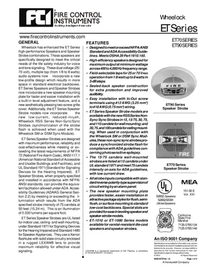 Datasheet for the Gamewell FCI ET Series Speaker Strobes, published in 2003. Document No: 9020-0579, Rev: 1.0. 21 models including ET70-R, ET70-W, ET90-W and 18 additional variants. Detailed technical specifications, electrical ratings, and agency listings.