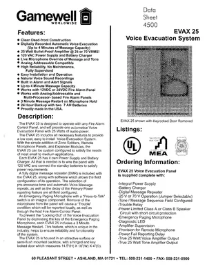 Datasheet for the Gamewell FCI EVAX 25. Document No: EV250598R1, Rev: R1. Model EVAX 25. Detailed technical specifications, electrical ratings, and agency listings.