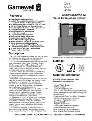 Datasheet for the Gamewell FCI EVAX 50. Document No: 4510, Rev: R1. Model EVAX 50. Detailed technical specifications, electrical ratings, and agency listings.