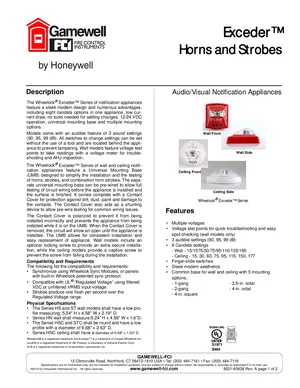 Datasheet for the Gamewell FCI Exceder Horns and Strobes, published in 2010. Document No: 9021-60638, Rev: A. 18 models including HSR, HSW, HSRC and 15 additional variants. Engineering specifications, wiring diagrams, and mounting dimensions.