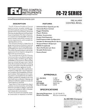 Datasheet for the Gamewell FCI FC-72 Series, published in 2003. Document No: 9020-0002, Rev: 1.5. 18 models including FC-72, FC-72-1, ADAM-6-A and 15 additional variants. Engineering specifications, wiring diagrams, and mounting dimensions.