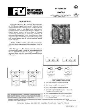 Datasheet for the Gamewell FCI FC-72 Series ADAM-6, published in 1997. Document No: 9020-0012, Rev: 1.3. 4 models including ADAM-6, BCM-6, TCM-6 and 1 additional variants. Engineering specifications, wiring diagrams, and mounting dimensions.