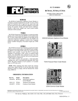 Datasheet for the Gamewell FCI FC-72 Series BCM-6A, TCM-6, CCM-6, published in 1997. Document No: 9020-0259, Rev: 1.3. 5 models including BCM-6A, TCM-6, CCM-6 and 2 additional variants. Product features, environmental operating limits, and compatibility data.