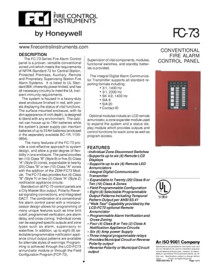 Datasheet for the Gamewell FCI FC-73, published in 2001. Document No: 9020-0523, Rev: B. 9 models including FC-73, ZDM-FC73, LCD-FC73 and 6 additional variants. Detailed technical specifications, electrical ratings, and agency listings.