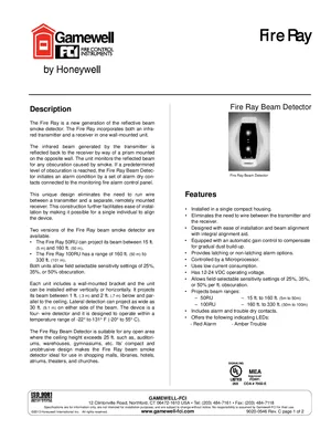 Datasheet for the Gamewell FCI Fire Ray, published in 2013. Document No: 9020-0546, Rev: C. Models 50RU and 100RU. Product features, environmental operating limits, and compatibility data.