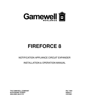 Installation and Operations Manual for the Gamewell FCI FIREFORCE 8, published in 2001. Document No: 71981, Rev: Issue A. Model FIREFORCE 8. Complete setup guide and operational workflows.