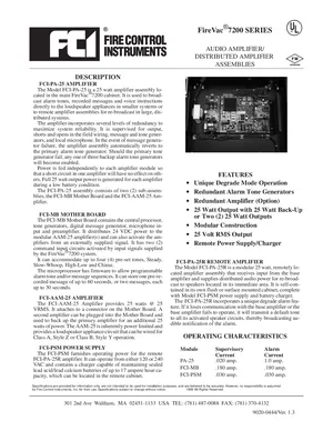 Datasheet for the Gamewell FCI FireVac 7200 Series, published in 1998. Document No: 9020-0444, Rev: Ver. 1.3. 6 models including FCI-PA-25, FireVac 7200, FCI-MB and 3 additional variants. Product features, environmental operating limits, and compatibility data.