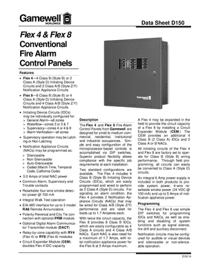 Datasheet for the Gamewell FCI Flex 4 and Flex 8, published in 2000. Document No: DS-D150, Rev: 1/00. 14 models including Flex 4, Flex 8, CEM and 11 additional variants. Product features, environmental operating limits, and compatibility data.