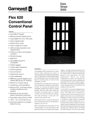 Datasheet for the Gamewell FCI Flex 620, published in 1999. Document No: 3000. 10 models including Flex 620, F624, F628 and 7 additional variants. Detailed technical specifications, electrical ratings, and agency listings.