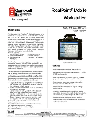 Datasheet for the Gamewell FCI FocalPoint Mobile Workstation, published in 2013. Document No: 9021-60283, Rev: D. Models FPT-MOBILE and FPT-MOBILE-HD. Product features, environmental operating limits, and compatibility data.