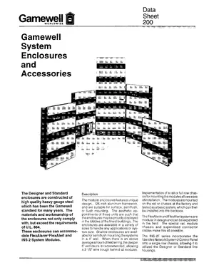 Datasheet for the Gamewell FCI Gamewell System Enclosures, published in 1999. Document No: 200, Rev: 8/99 (revised). 8 models including 30301, 30302, 30303 and 5 additional variants. Engineering specifications, wiring diagrams, and mounting dimensions.