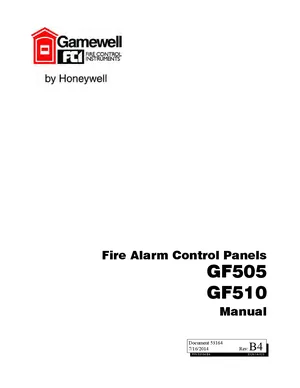 Installation, Operations, and Programming Manual for the Gamewell FCI GF505 and GF510, published in 2014. Document No: 53164, Rev: B4. Models GF505 and GF510. Mounting and wiring instructions, user operating guides, and system software setup.
