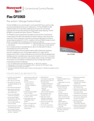 Datasheet for the Gamewell FCI GF506D, published in 2018. Document No: 9021-60466, Rev: E. 16 models including GF506D, GFANN-80, GFANN-RLY and 13 additional variants. Product features, environmental operating limits, and compatibility data.