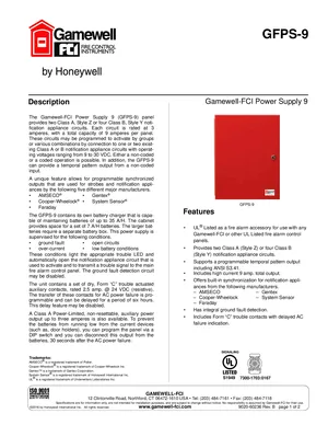 Datasheet for the Gamewell FCI GFPS-9, published in 2016. Document No: 9020-60236, Rev: B. Models GFPS-9 and GFPS-9RB. Detailed technical specifications, electrical ratings, and agency listings.