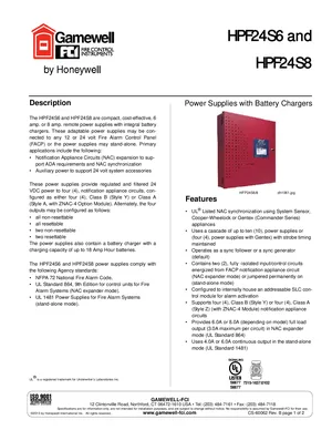 Datasheet for the Gamewell FCI HPF24S6 and HPF24S8, published in 2013. Document No: CS-60062, Rev: B. 5 models including HPF24S6, HPF24S8, FCPS-24S6RB and 2 additional variants. Detailed technical specifications, electrical ratings, and agency listings.