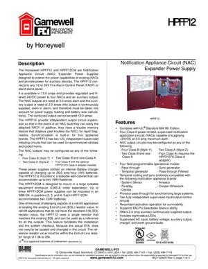 Datasheet for the Gamewell FCI HPFF12, published in 2015. Document No: 9021-60628, Rev: D. 4 models including HPFF12, HPFF12E, HPFF12CM and 1 additional variants. Engineering specifications, wiring diagrams, and mounting dimensions.