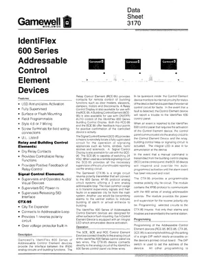 Datasheet for the Gamewell FCI IdentiFlex 600 Series Control Element Devices, published in 1999. Document No: 3170. 4 models including RCE-95, BCE-95, SCE-95 and 1 additional variants. Detailed technical specifications, electrical ratings, and agency listings.