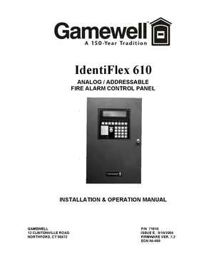 Installation, Operations, and Programming Manual for the Gamewell FCI IdentiFlex 610, published in 2004. Document No: 71810, Rev: E. 15 models including IdentiFlex 610, IF 610, IF 610-126 and 12 additional variants. Hardware installation, alarm/fault management, and advanced system configuration.